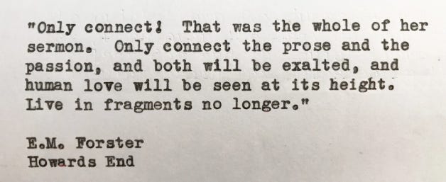 “Only connect! That was her whole sermon. Only connect the prose and the passion, and both will be exalted, and human love will be seen at its height. Live in fragments no longer.” —Howards End, chapter 22